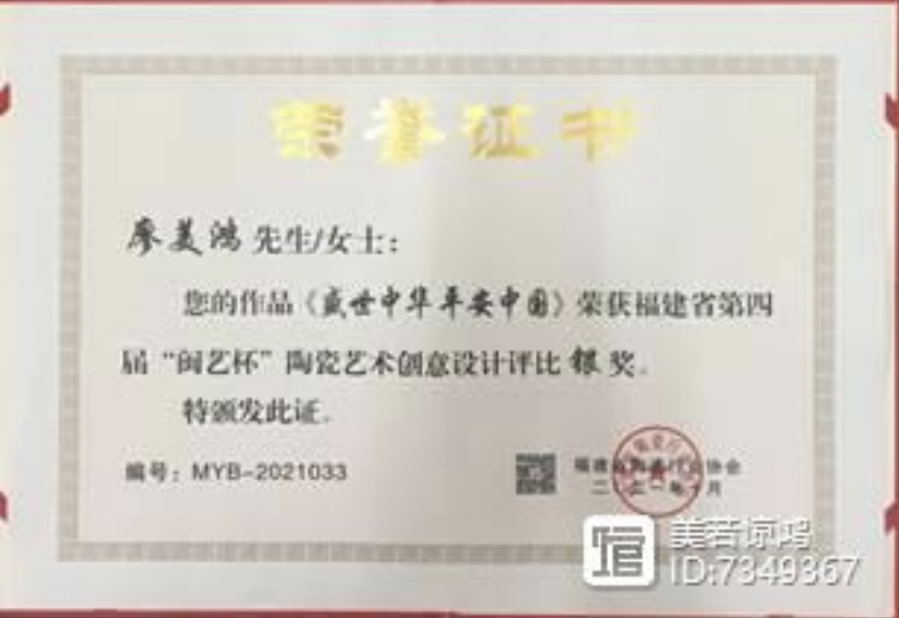 在福建省第四届“闽艺杯”陶瓷艺术创意设计评比中,本人选送的《盛世中华 平安中国》铁红金圈釉花瓶(组)荣获银奖。