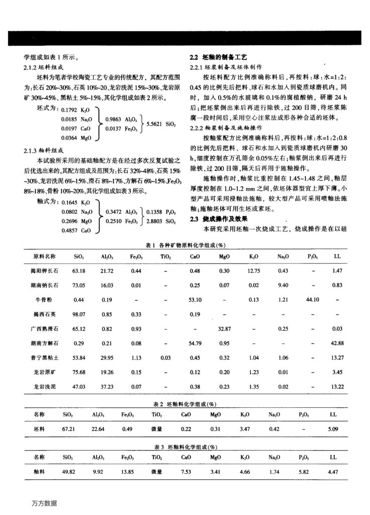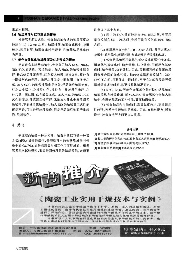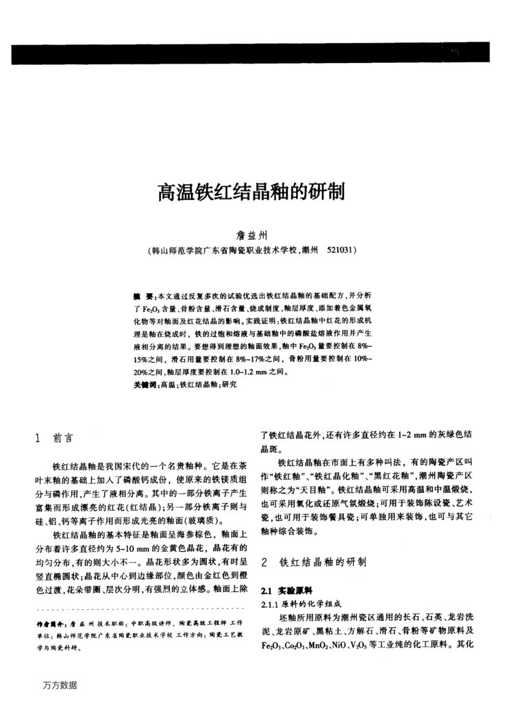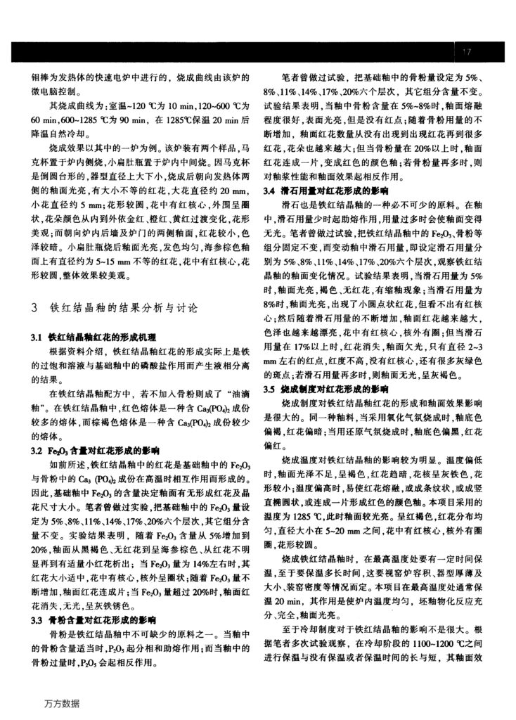 本文通过反复多次的试验优选出铁红结晶釉的基础配方,并分析 了Fe20,含量、骨粉含量、滑石含量、烧成制度、釉层厚度、添加着色金属氧 化物等对釉面及红花结晶的影响。实践证明:铁红结晶釉中红花的形成机 理是釉在烧成时,铁的过饱和熔液与基础釉中的磷酸盐熔液作用并产生 液相分离的结果。要想得到理想的釉面效果,釉中Fe20,量要控制在8%~ 15%之间。滑石用量要控制在8%一17%之间,骨粉用量要控制在10%~ 20%之间.釉层厚度要控制在1.1.2 mill之间。