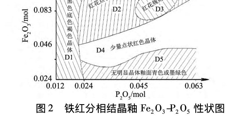 摘要: 以钾长石、骨灰、三氧化二铁、煅烧滑石、石英、高岭土为原料制备铁红分相釉。探究 SiO2 /Al2 O3 摩尔比、 Fe2O3-P2O5 组成引起的釉面性状变化。结合XRD以及扫描电镜(SEM)和能谱分析,对铁红釉的分相和析晶进行 定性和定量的分析。研究结果表明: 当 SiO2 /Al2 O3 摩尔比为 10,Fe2 O3 /P2 O5 摩尔比为 2 时,釉表面为分散规则大 红花。SEM 和 EDS 显示釉中存在液相分离而带来的组分不均匀的现象,主要表现为 Fe 元素组分的差异; 经 XRD 结果证实,在富铁相中析出的红色晶体为 Fe2 O3 。
